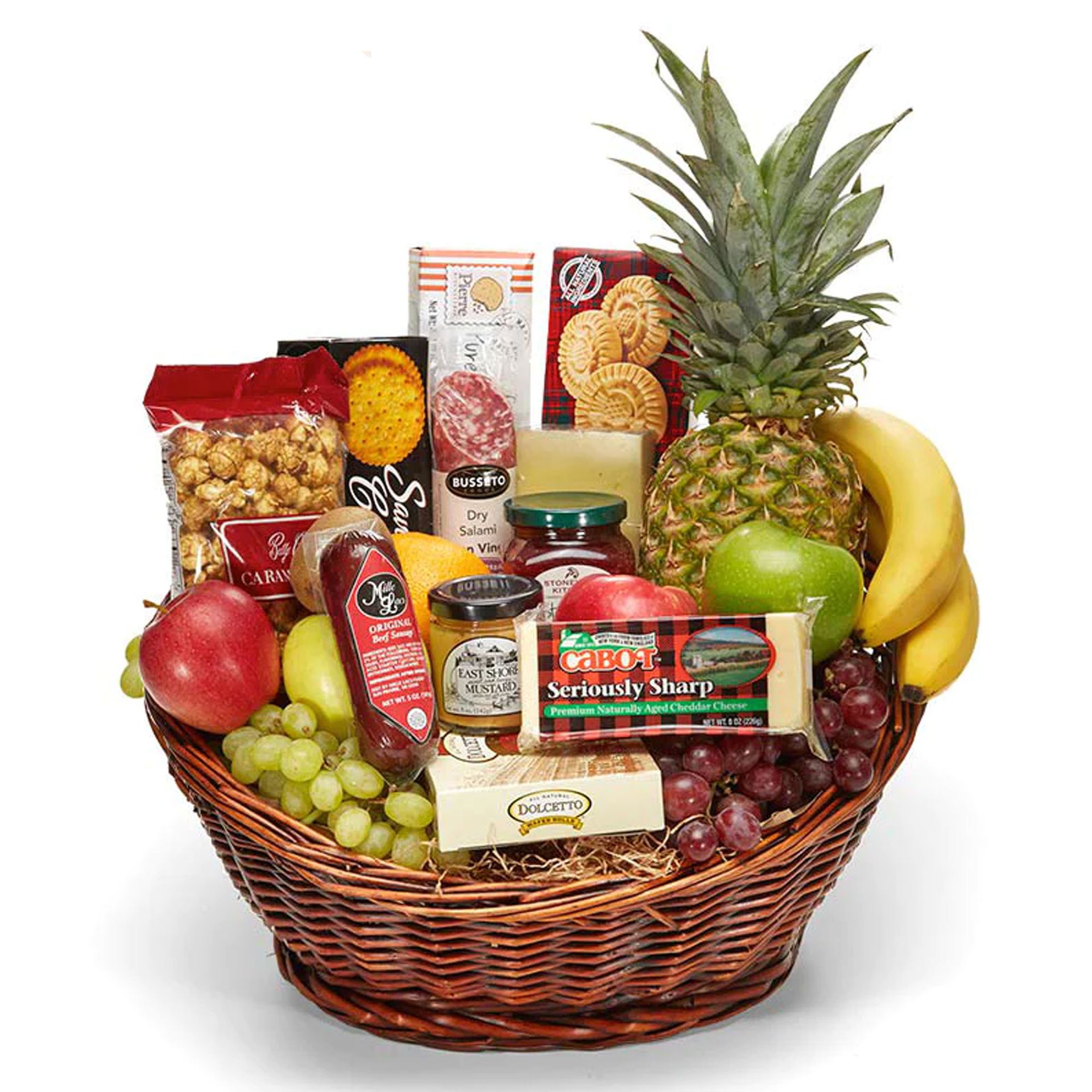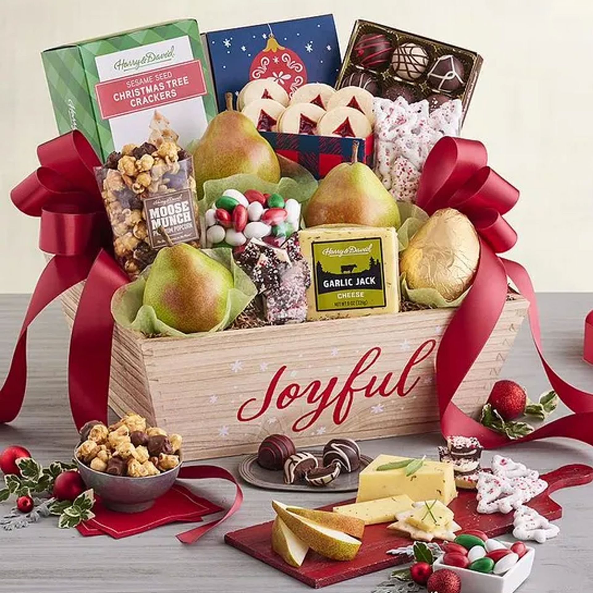 This gift basket from Harry & David contains a diverse mix of some of the most well-loved sweet and savory festive treats. Including fruit, crackers, chocolate and nuts, this Christmas basket can create a merry festive spread.