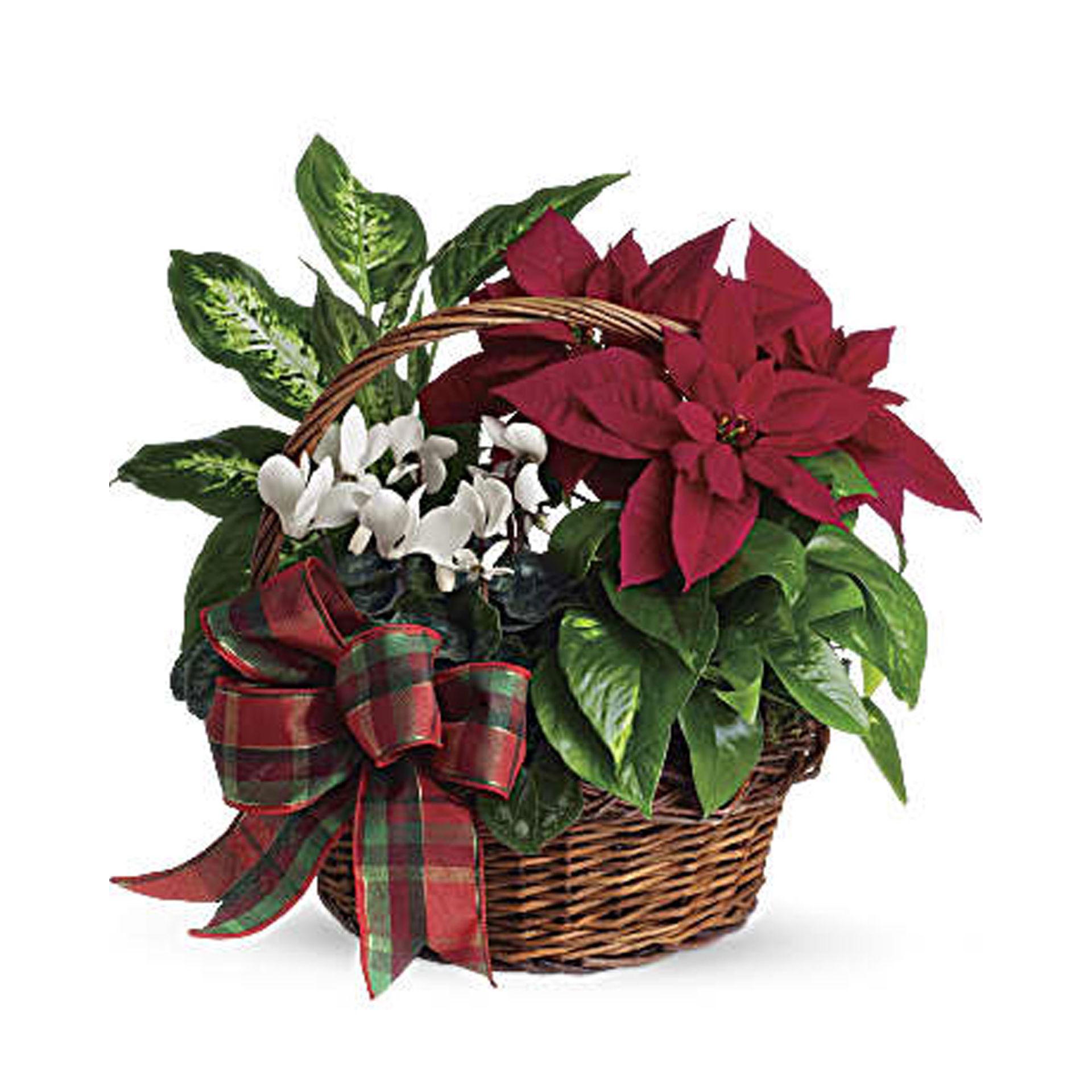 Christmas flowers and plants can make for beautiful Christmas table centerpieces. This innovative Christmas basket idea from teleflora features a mix of four potted plants, a red poinsettia, white cyclamen, green pothos and variegated dieffenbachia, creating a long-lasting holiday gift for all the plant lovers out there.