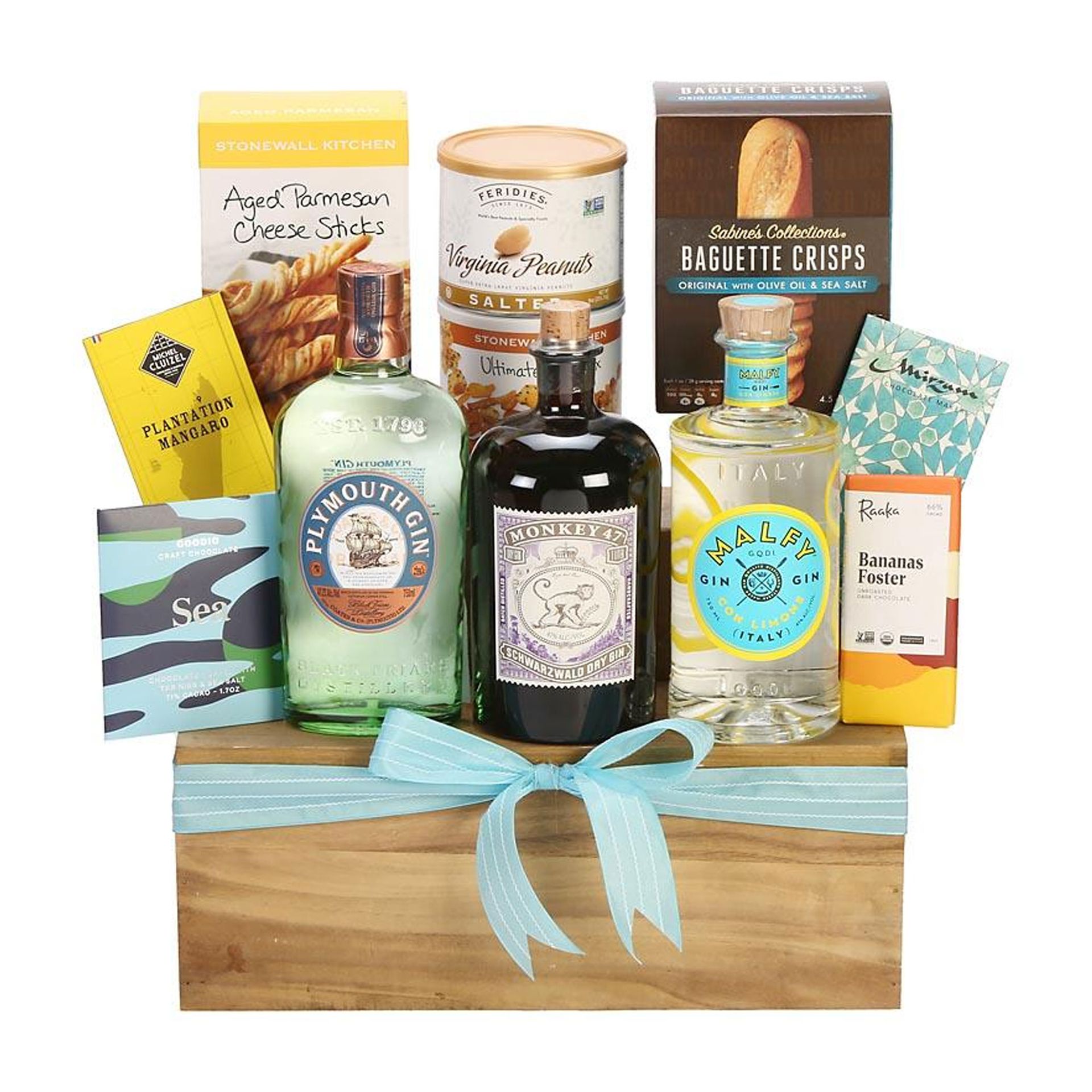 Let the drinking be gin! This Christmas basket by Mel & Rose contains three gins, Monkey 47 Gin, Plymouth Gin, Malfy Gin Limone, and a selection of sweet and savory snacks, designed to complement the three distinct flavors.