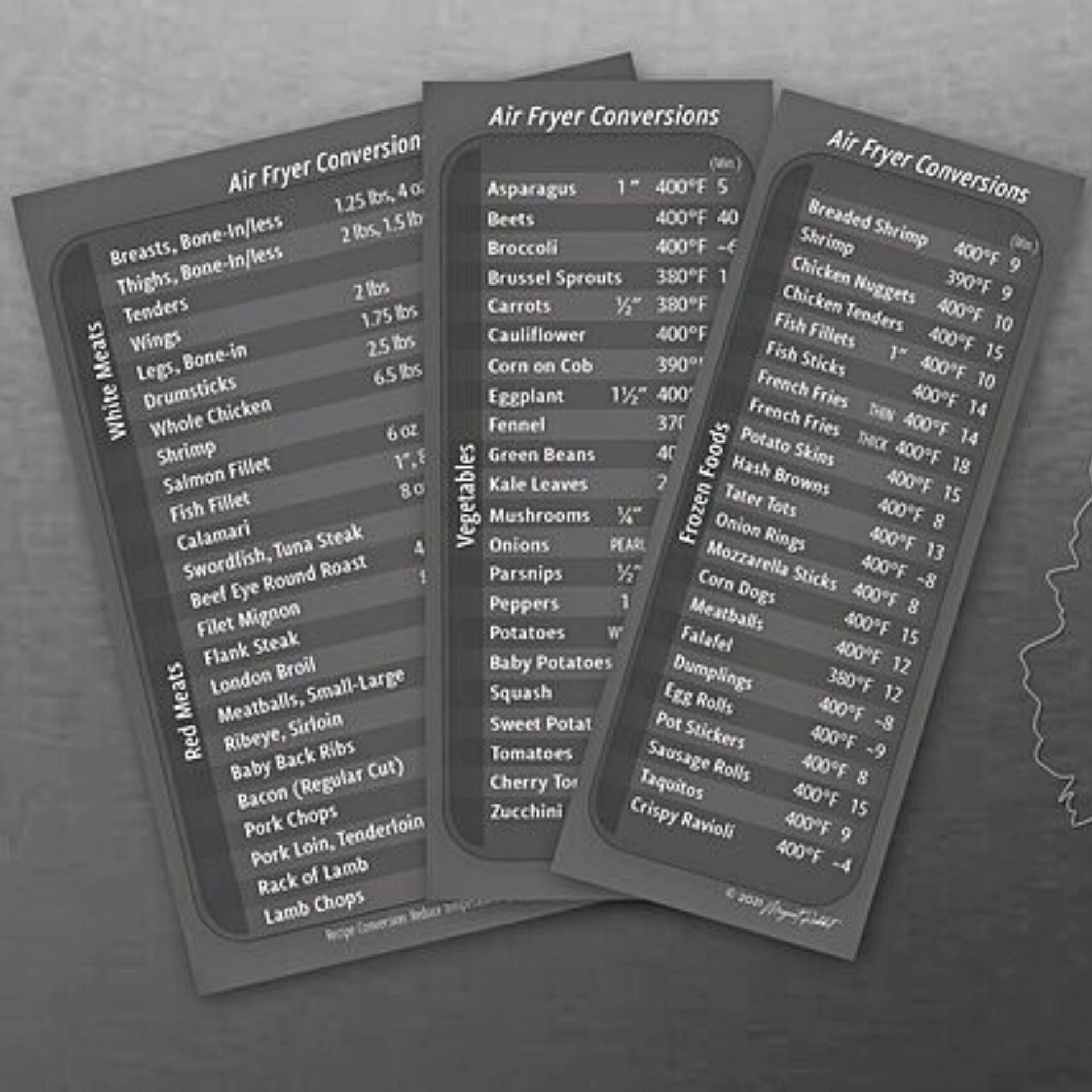 This Magnetic Air Fryer Cheat Sheet Set includes a bonus Conversion & Measurement magnet, helping you easily convert metrics while cooking and baking.