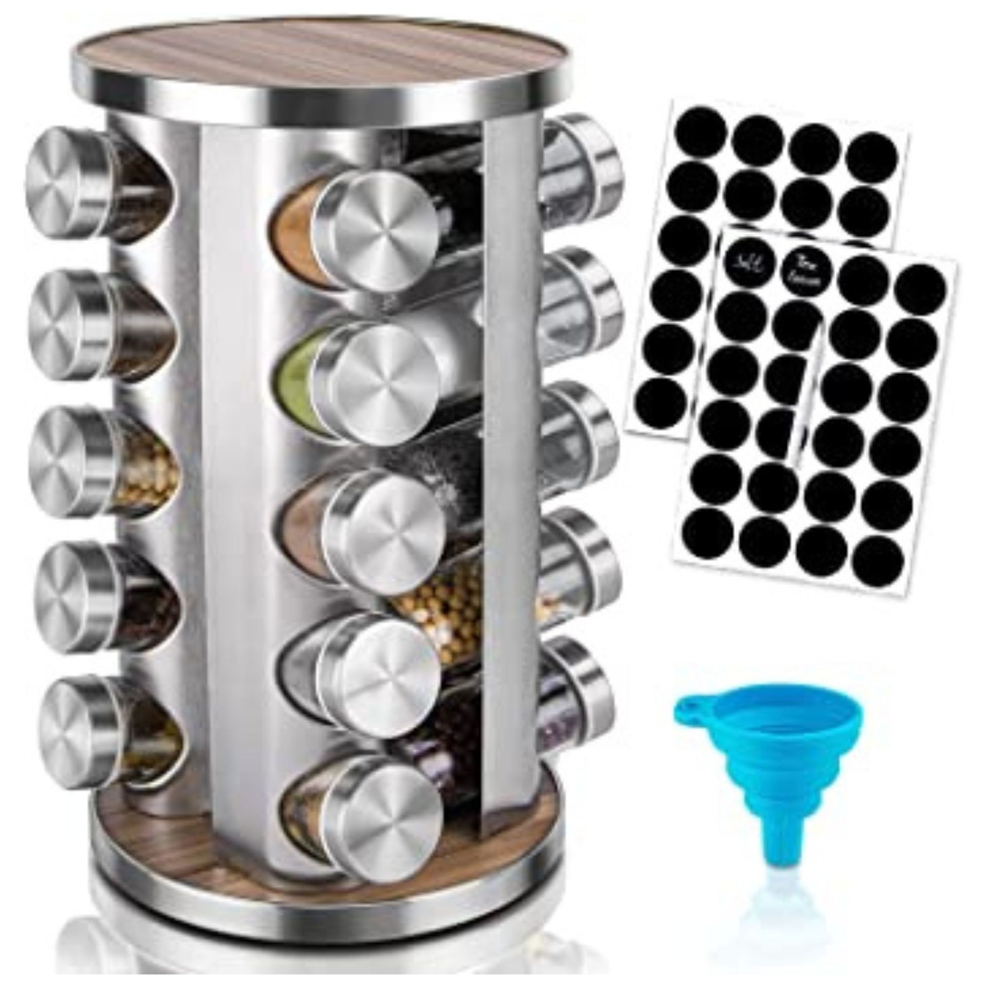 The spice organizer is equipped with 20 3oz refillable jars and a silicone funnel to help you transfer the spices.