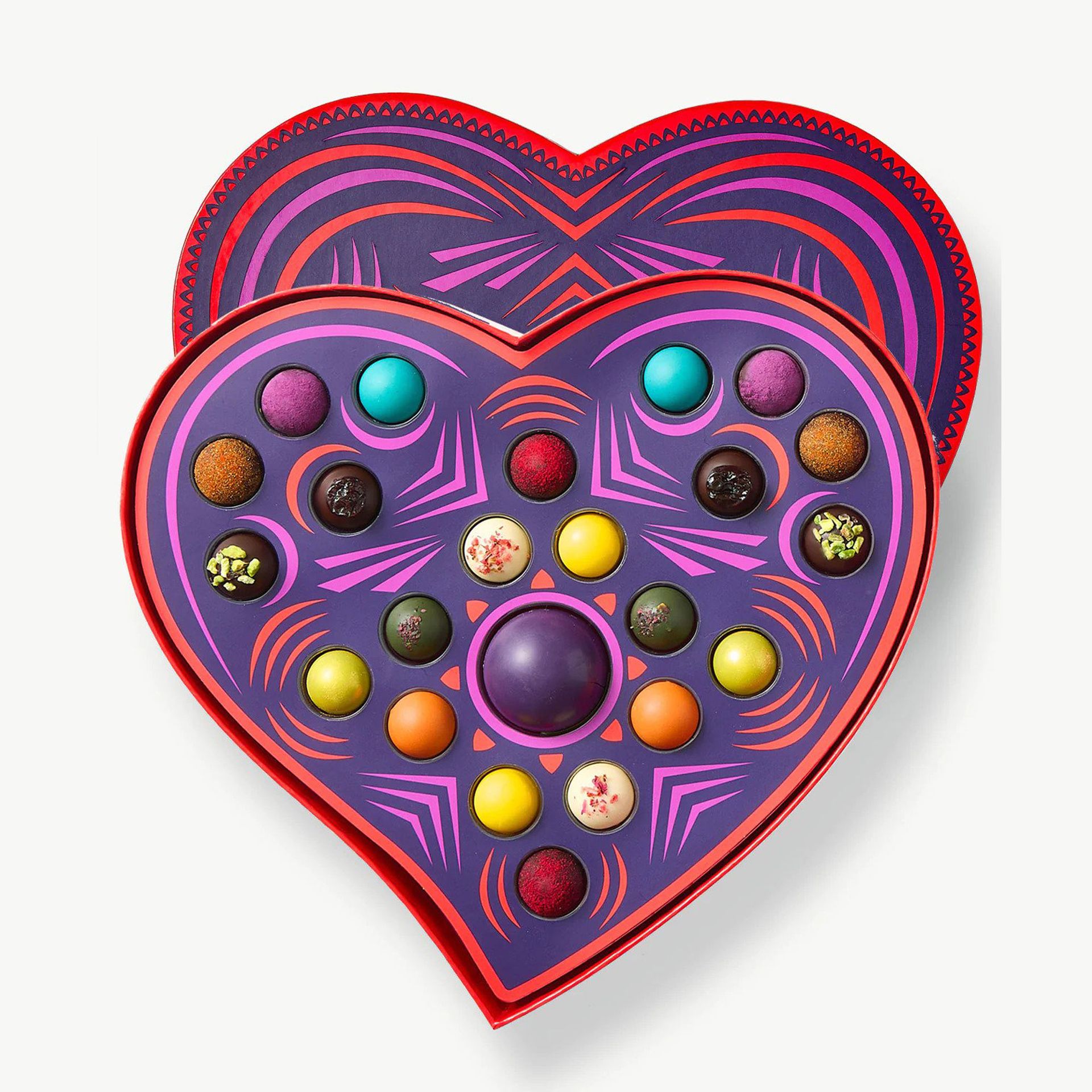 A more modern take on a traditional heart box of chocolates, this colorful gift contains a luxurious assortment of truffles with flavors from around the world, from Montmorency cherry to Bronte pistachio.