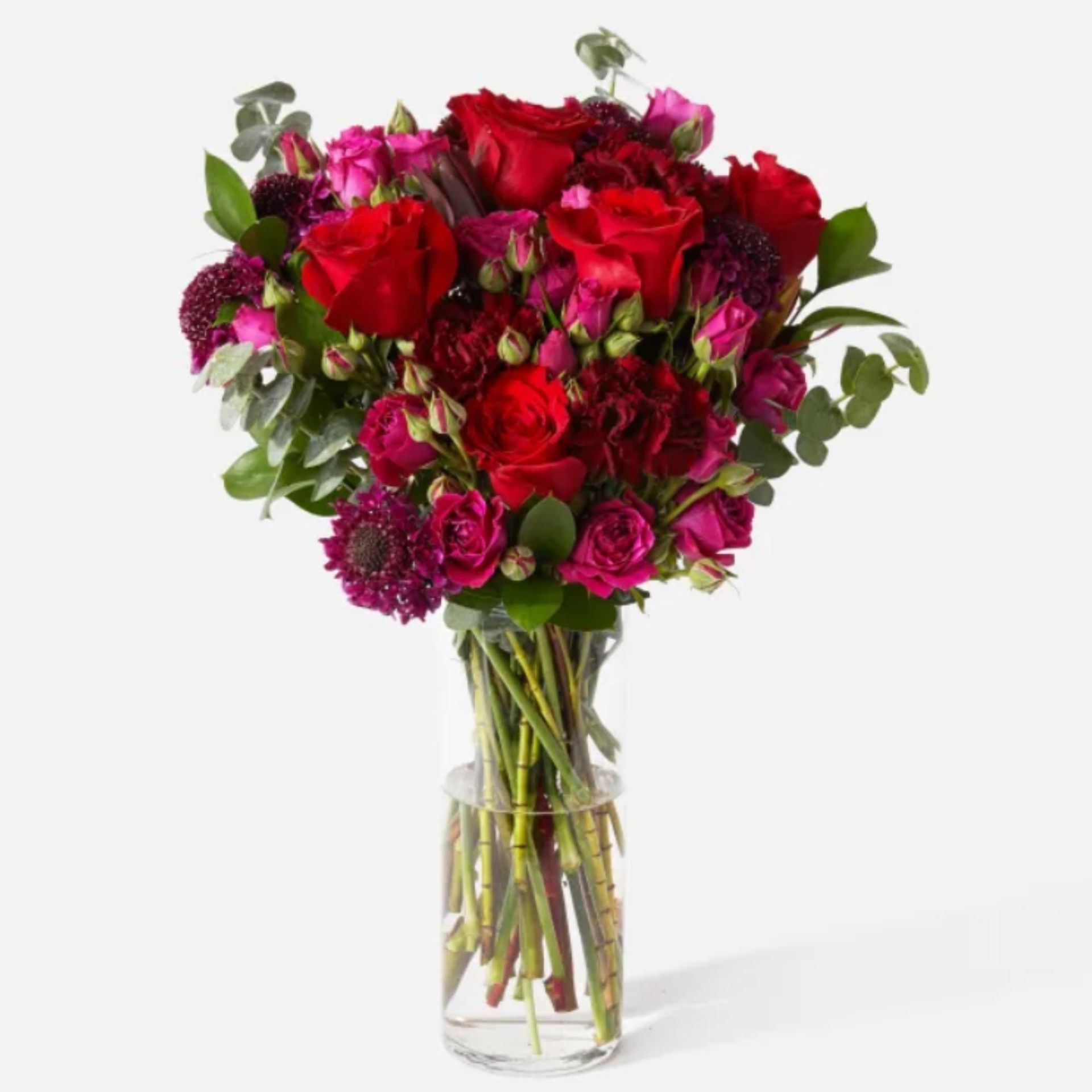 For a twist on the classic red roses, the Eros bouquet brings in fresh bursts of carnations, leucadendron, and eucalyptus.